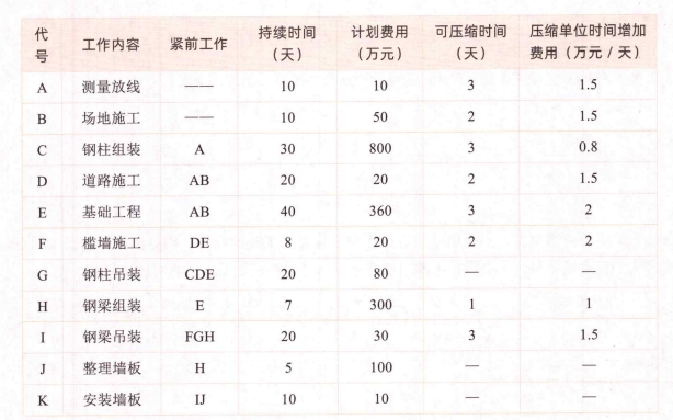 第4题:某施工单位承包了一厂房钢结构工程,钢结构采用高强度螺栓连接。工程的围护材料(墙板、屋面板及其防火涂料)由业主采购。合同工期为100天,并约定提前1天奖励5万元,延误一天罚款5万元。施工单位项目部进场后,依据合同施工图、验收规范及总承包的进度计划,编制了厂房工程的施工方案、进度计划、劳动力计划和费用计划。正式施工时,因厂房需提前验收,业主要求该厂房工程提前5天完工。项目部按工作持续时间和计划费用(见下表)分析,在关键工作上,以最小的赶工增加费用,在钢梁吊装工作前赶出了5天。进入钢梁吊装工作时,发现有部分钢梁高强度螺栓连接处的摩擦面上有标记,大六角头螺栓连接副的垫圈数量不符合要求。重新处理用去了3天,并增加费用3万元,项目部又赶工3天,该厂房工程最终按业主要求提前5天竣工,验收合格后,资料整理齐全,准备归档。